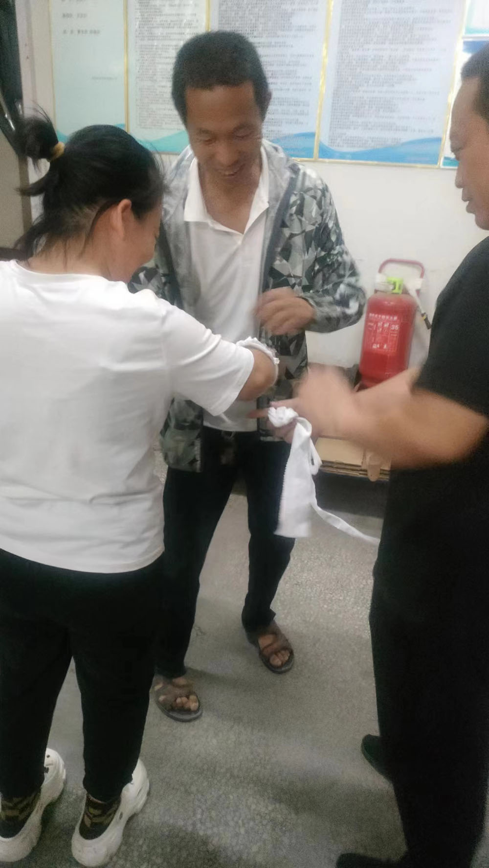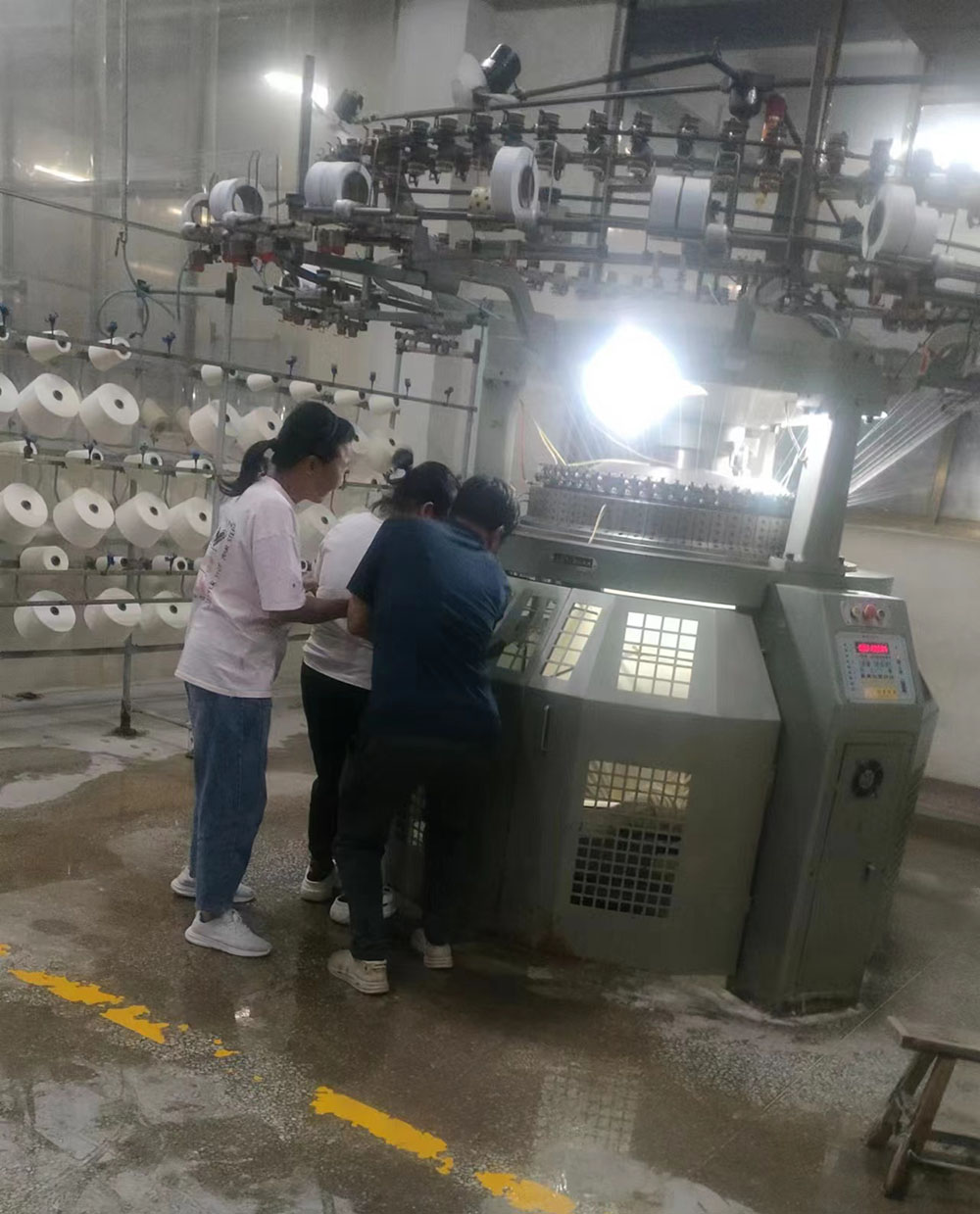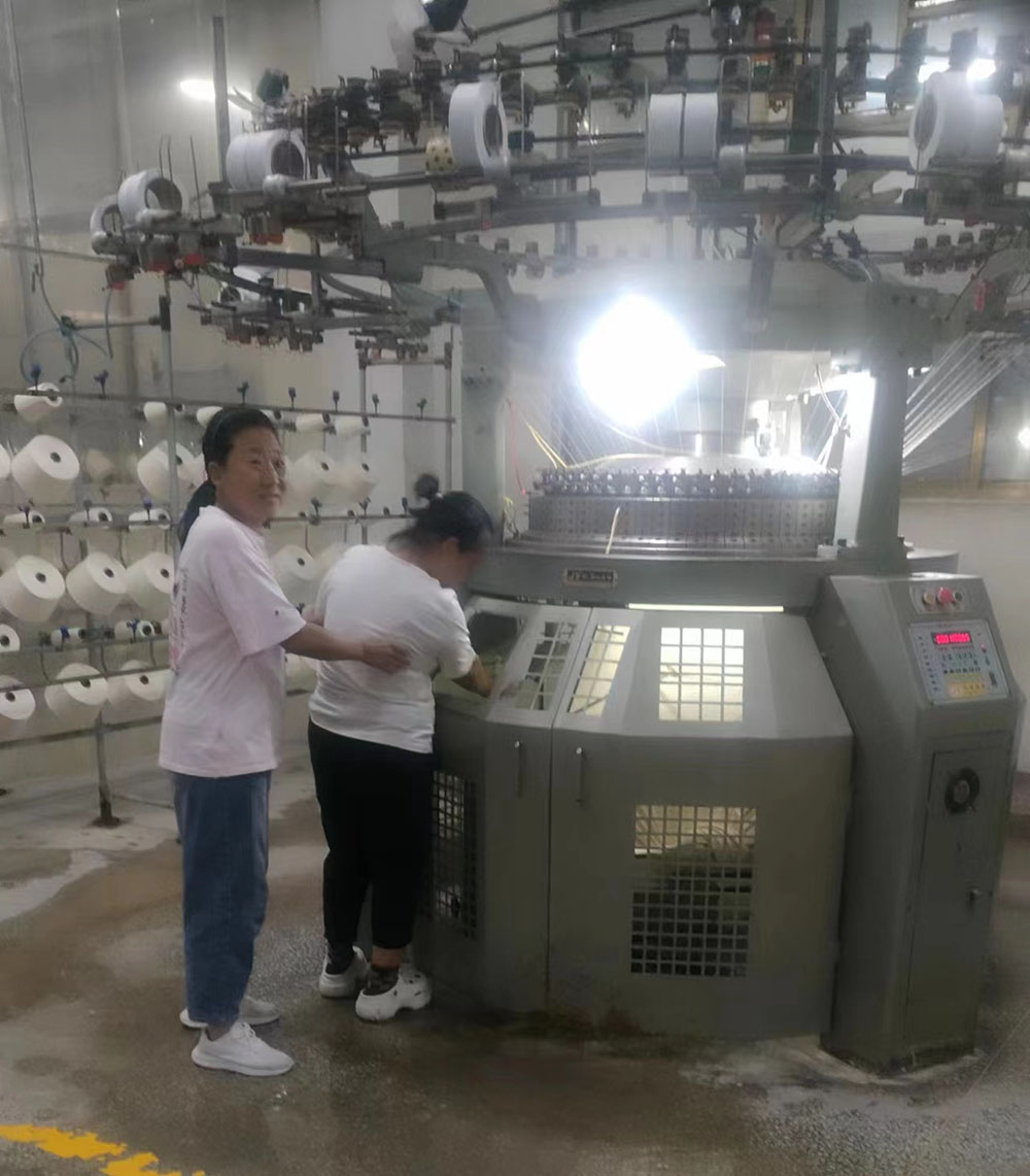 首先,模擬車間生產(chǎn)現(xiàn)場出現(xiàn)機械傷害事故,有員工被卷入大圓機中受傷,馬上啟動應(yīng)急預(yù)案。各應(yīng)急小組緊張地投入到應(yīng)急救援工作之中,搶救傷員、救護包扎、緊急聯(lián)絡(luò),各項工作有序展開。救援小組立即關(guān)停機器,將受傷員工從機器中搶救出來。救護小組給傷員檢查傷情,包扎止血。聯(lián)絡(luò)小組打120請求派救護車緊急救護,受傷員工得到了及時救治。